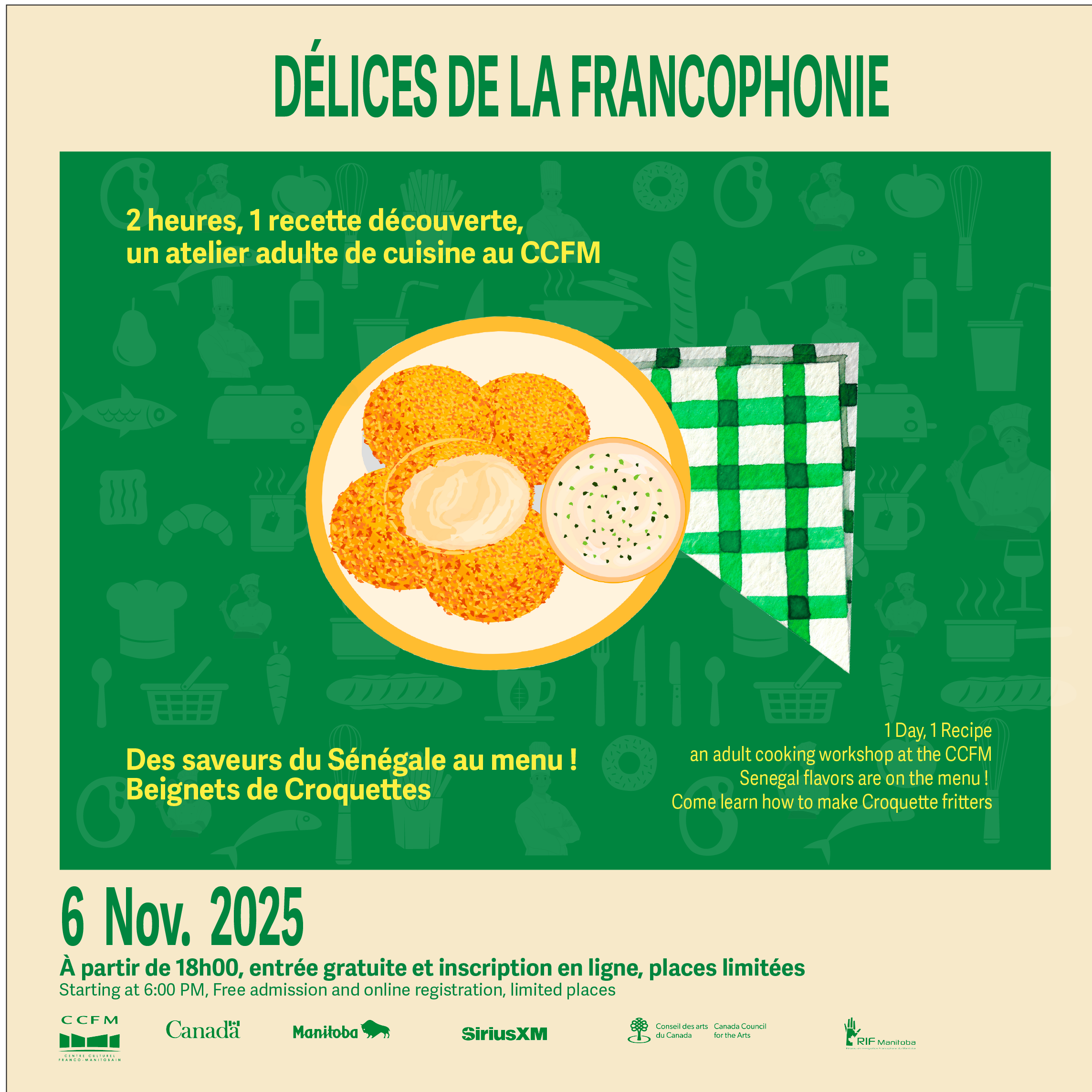 Envolez‑vous au Sénégal et laissez‑vous guider par la cheffe du jour, Fatima Thiam, pour préparer des beignets de croquettes à se lécher les doigts. Ici, pas de radio-cancan : tous les secrets de cette recette emblématique vous seront révélés, pour une dégustation chaleureuse et authentique !