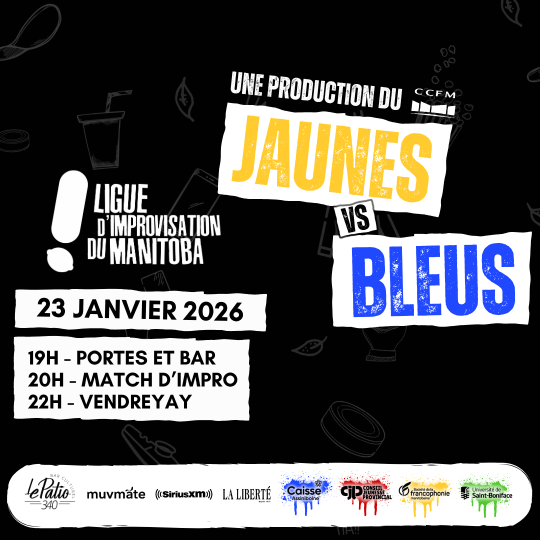 Le 23 janvier, dès 20h, les Jaunes et les Bleus s'affronteront dans l'espoir de conquérir tous vos gloussements et rires ! À coups de répliques comiques, de personnages inattendus et de talents surprenants, les joueurs et les joueuses déploient toute leur énergie pour offrir un match survolté*. Pour prolonger le plaisir, les VENDREYAY prennent le relais dès 22h15 :- Karaoké pour les participants et participantes les plus audacieux et audacieuses