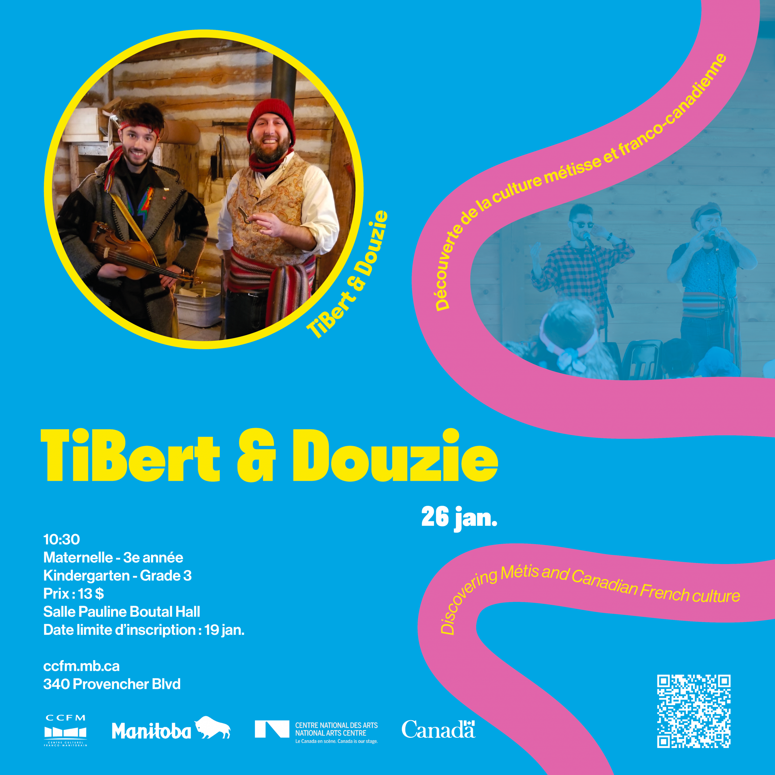 Le conteur, jongleur et musicien TiBert s’associe au maître du violon Douzie pour embarquer les petits voyageurs dans son canot imaginaire à la découverte de la culture métisse et franco-canadienne. Ce spectacle interactif est conçu comme un véritable voyage générationnel, sonore et visuel, à travers les époques. Il mêle harmonieusement des éléments culturels traditionnels et modernes. Avec humour, énergie et complicité, le duo partage la richesse du patrimoine métis et francophone tout en célébrant la diversité culturelle d’aujourd’hui. Adapté aux plus petits, ce spectacle invite à se reconnecter avec une culture toujours bien vivante au Manitoba, tout en mettant en lumière son évolution. C’est une belle occasion pour les enfants de découvrir ou redécouvrir des éléments du paysage culturel manitobain à travers des contes et des musiques traditionnels, rythmés d’une touche de beats électro.